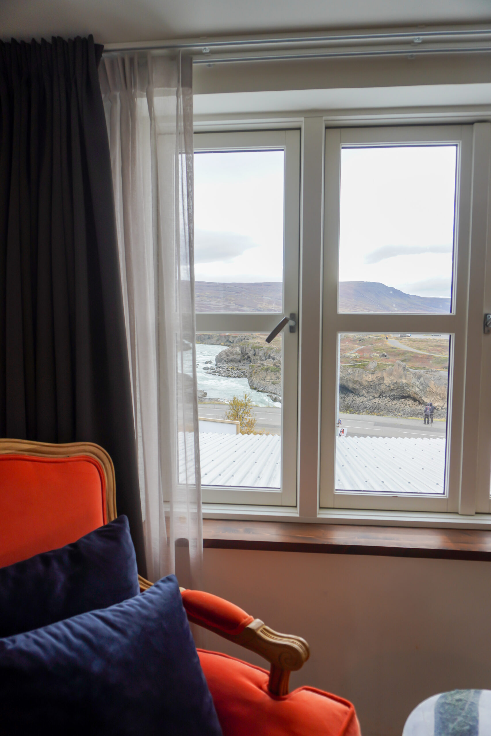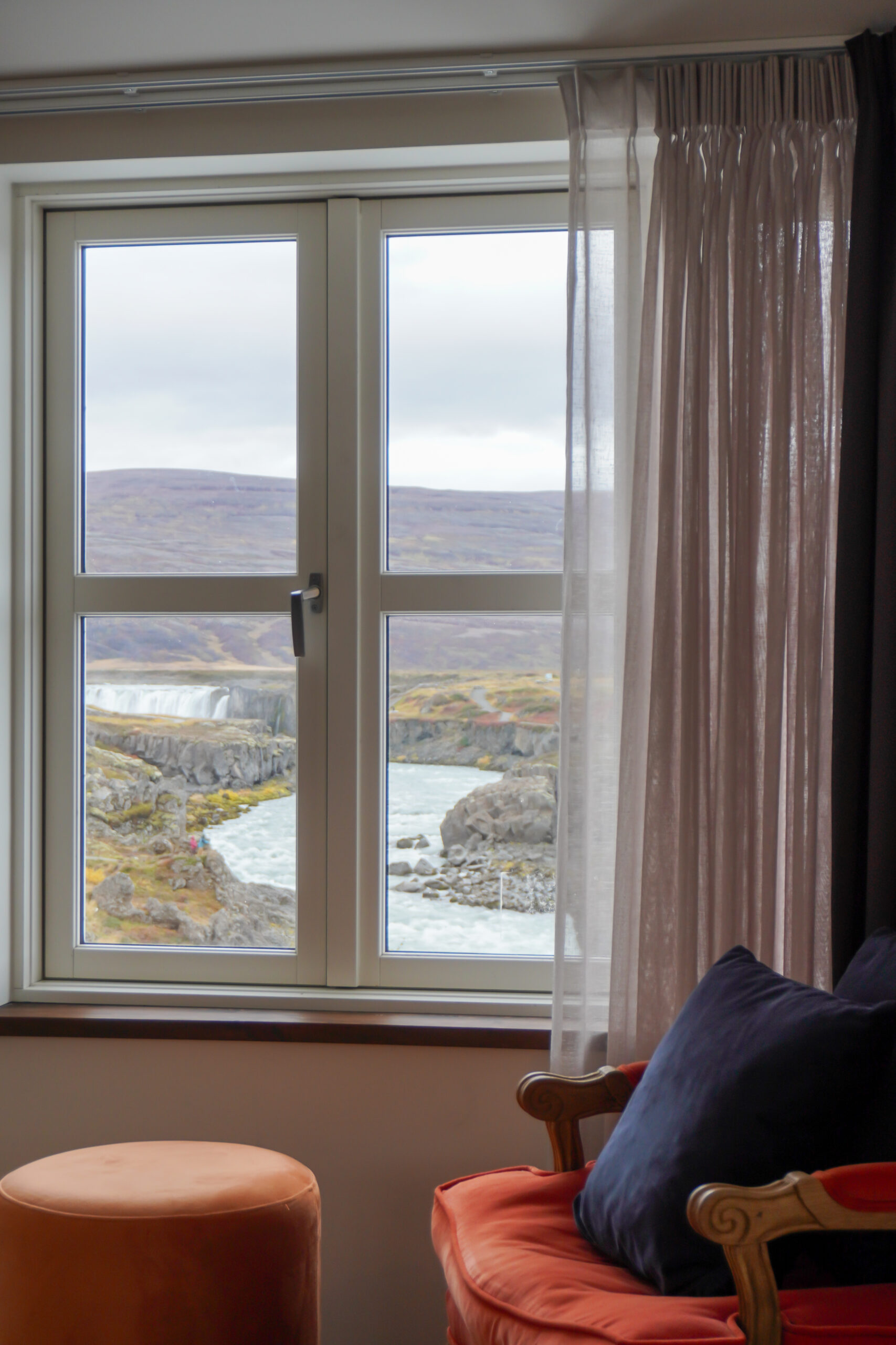 Enjoy a nice cocktail on our terrace at any time of the day contemplating the view on Goðafoss.
